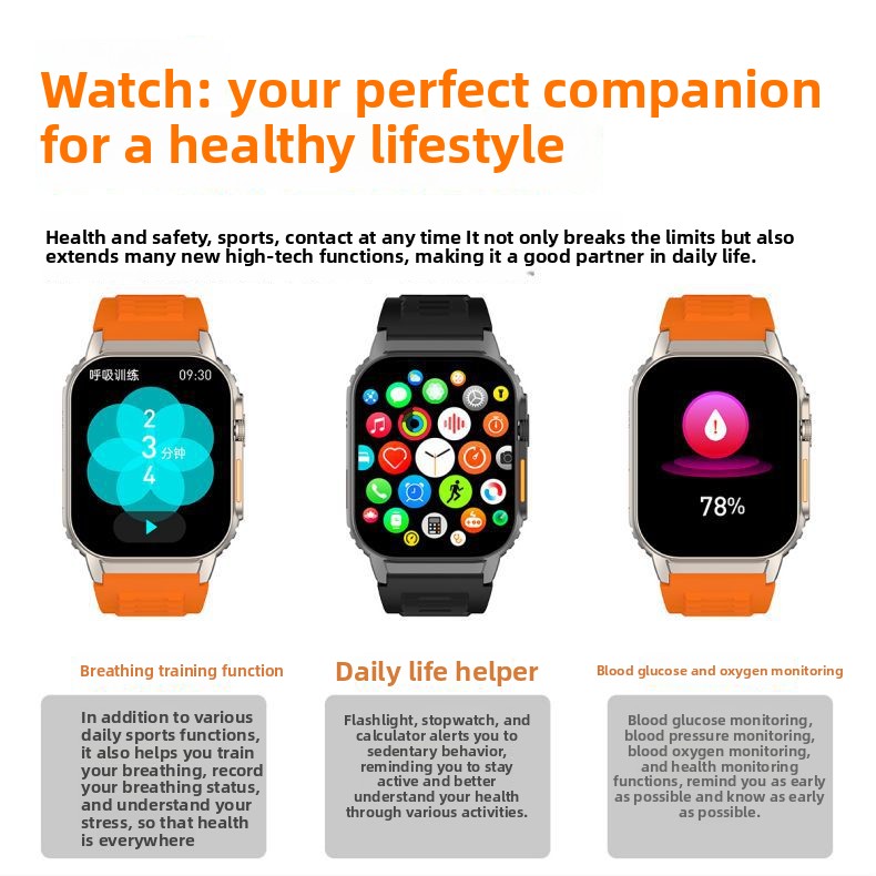 Health Monitoring: Comprehensive health tracking with blood glucose, heart rate, blood oxygen, body temperature, and blood pressure monitoring